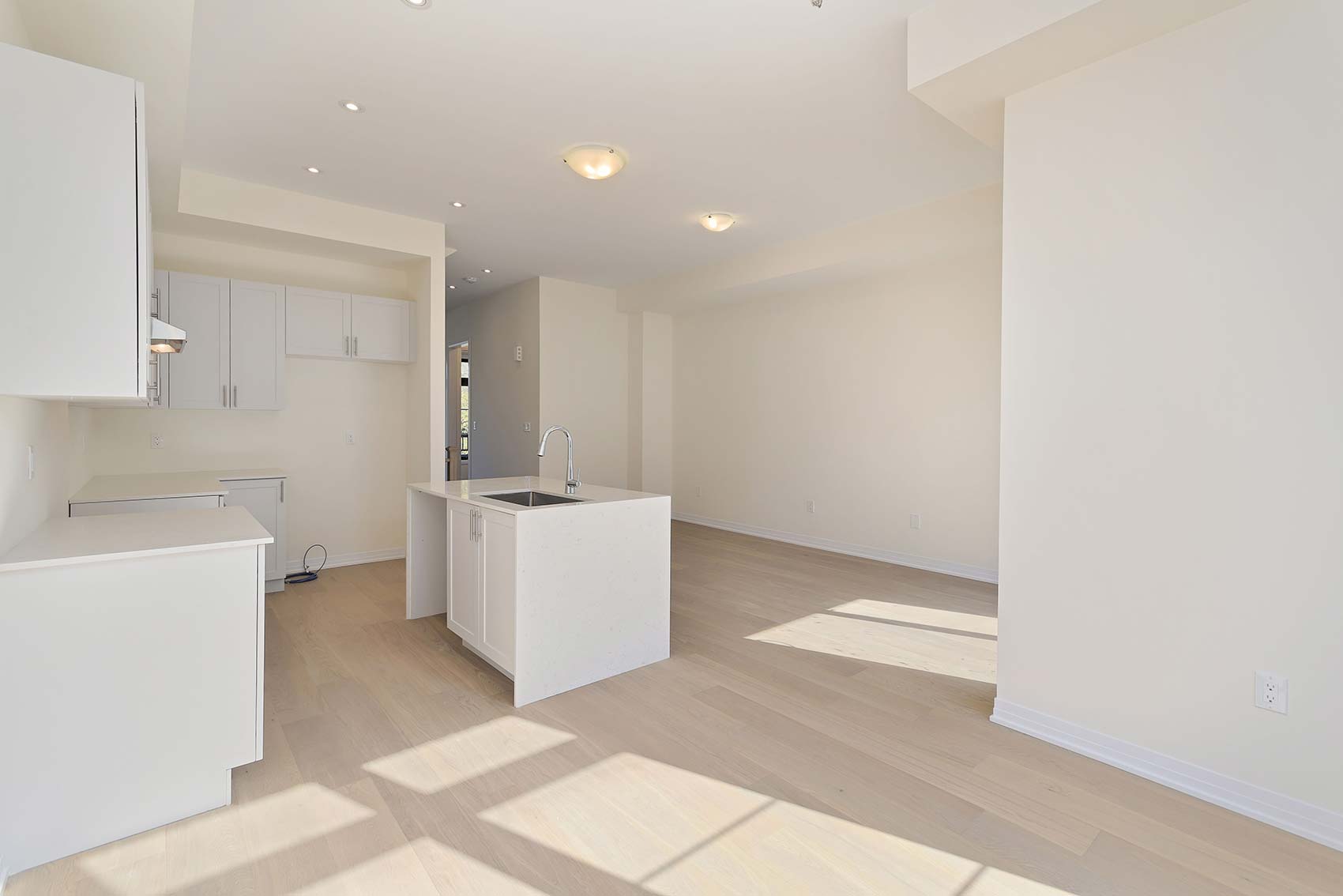 The main floor features hardwood flooring throughout, a formal dining area with large window, and a bright great room with a walk-out to the balcony. The open-concept kitchen is equipped with a centre island, breakfast bar, and upgraded rough-ins for gas stove and fridge waterline. A powder room and full laundry room complete this level.